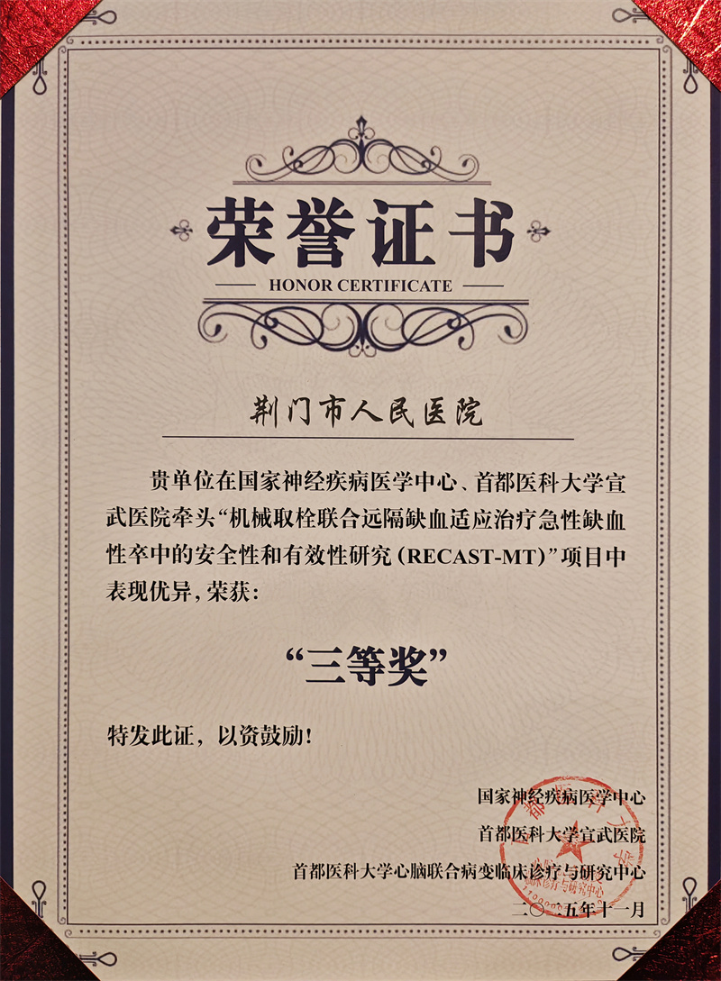 会上,荆门市人民医院(荆门市脑血管病医院)在国家神经疾病医学中心、首都医科大学宣武医院牵头的“机械取栓联合远隔缺血适应治疗急性缺血性卒中的安全性和有效性研究(RECAST-MT)”项目中表现优异,荣获三等奖。该项“国家级”殊荣,不仅印证了医院在卒中急救前沿领域的领先实力,也标志着其临床科研水平获得了国内同行的高度认可。
