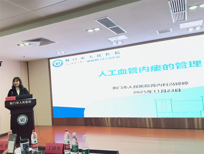 随后的人工血管内瘘规范化管理培训班上,郑启刚主任以《人工血管内瘘的建立与维护》为题,浅谈了人工血管内瘘的建立和AVG围术期的管理,分享了相关病例;荆门市人民医院肾内科副主任冯婷婷通过对人工血管内瘘相关知识的讲解,引出了人工血管内瘘管理上的难点,深入探讨了相关方案的可行性;荆门市人民医院血透中心护士长孙梦围绕人工血管内瘘的穿刺及维护技巧,详细阐述了相关要点及注意事项。